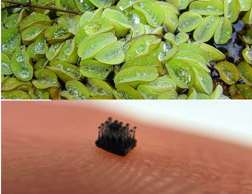 它就是Salvinia molesta,是一種原產(chǎn)于南美洲的浮蕨。它的葉子非常疏水,并且淹沒在水中時(shí)保留了一個(gè)空氣袋,這要?dú)w功于細(xì)小的防水毛發(fā)。